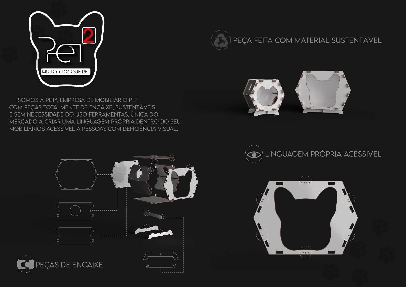 Nós somos a Pet², empresa de mobiliário pet inovadora e cheia de estilo. Nossas peças são todas de encaixe sem necessidade do uso de pregos ou parafusos, isso proporciona mais segurança e praticidade na hora de montar a casinha do seu pet. Vai viajar e não tem como levar a casinha do seu pet? aqui você não tem esse problema, é só desmontar a casinha e colocar na caixinha que ela tá pronta pra viagem. Além desse diferencial a pet² é também a única empresa do mercado com acessibilidade para pessoas com deficiência visual, nós desenvolvemos uma linguagem onde pessoas portadoras de deficiência visual tem total autonomia para montar sua casinha, criando inclusão e inovação, somos muito mais do que pet, somos Pet².